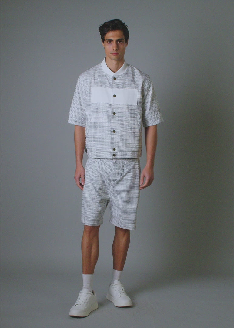 A single-pleated short in a jacquard dash fabric. Adds depth without weight. Lightweight. Breathable. Tailored with just enough structure. Built for movement and the movement. Finished with a concealed zip pocket to keep your valuables safe. Pairs with the Dash Jacket. Or stands on its own.