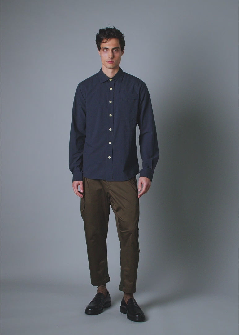 It was not easy to make this shirt. It involved dedicated collaboration with our factory. We started with our classic front placket and then removed all visible stitching on it with a special fold technique, a rare feat in shirt-making. We then removed all visible stitching on the pocket by folding and sewing it from the inside… it almost floats (see images).