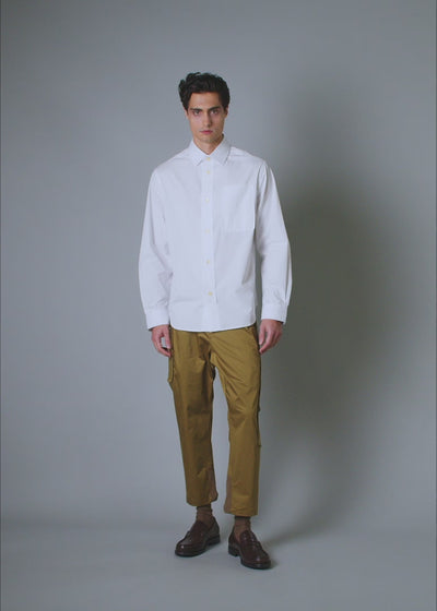 It was not easy to make this shirt. It involved dedicated collaboration with our factory. We started with our classic front placket and then removed all visible stitching on it with a special fold technique, a rare feat in shirt-making. We then removed all visible stitching on the pocket by folding and sewing it from the inside… it almost floats (see images).