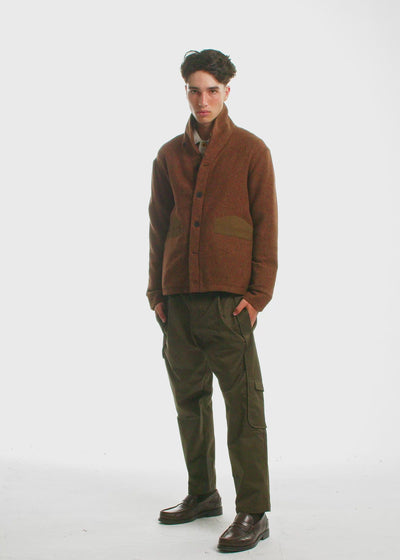 AlmondThis durable, wool-blend cardigan can be worn as a light jacket or mid-layer. The beauty of this piece lies in its details, including reinforced pocket facings, a shawl collar, and elbow patches. The interior is finished like a tailored jacket with our signature yellow seam cover trim. In true Descendant of Thieves fashion, it's unnecessarily well-made, destined to be rediscovered by your unborn grandchild in future vintage shops that don't yet exist.
