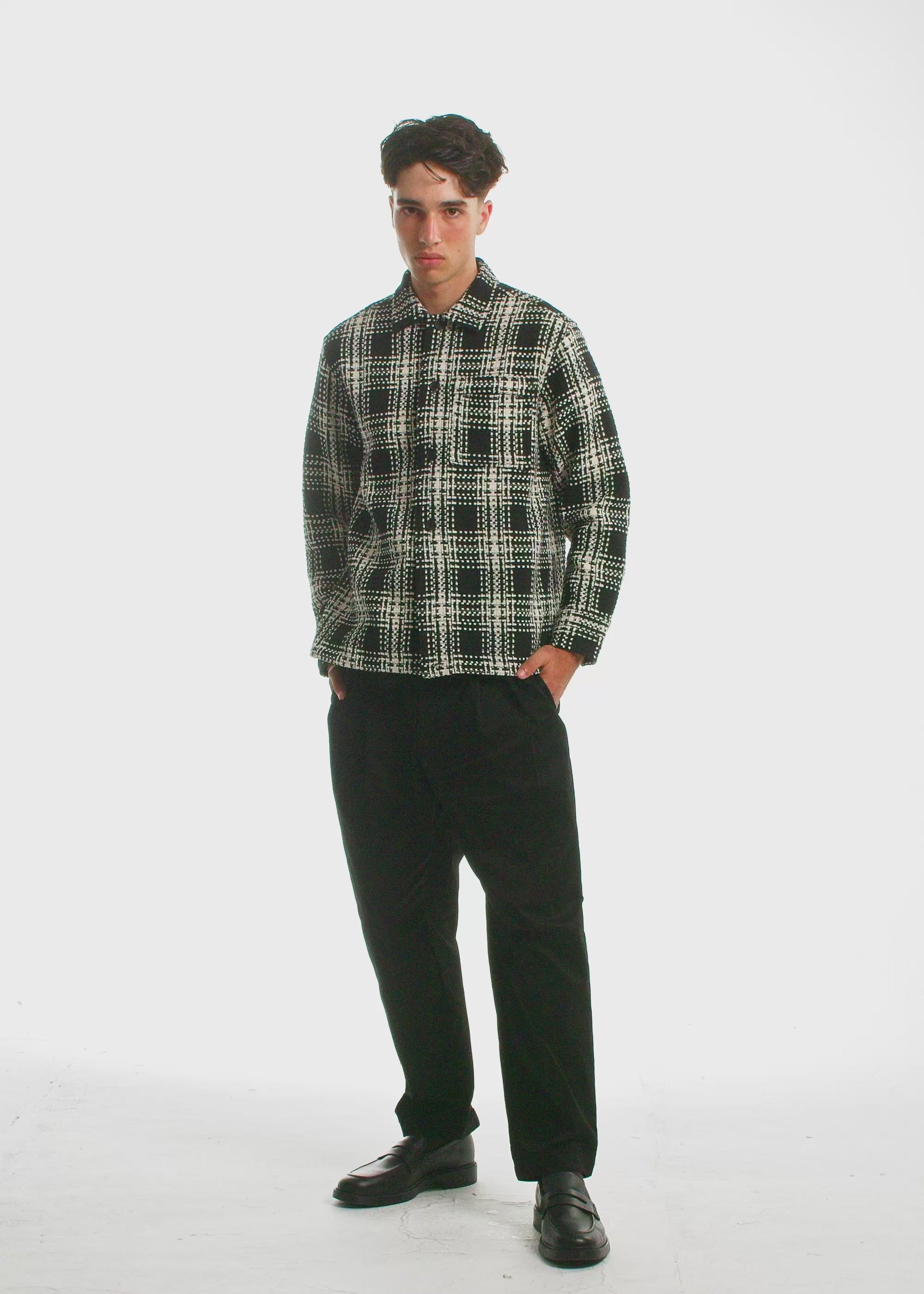Ruggi, a play on rugged, is built from a coarse tapestry weave that gives the fabric its raw strength. The clash of thick yarns and sharp contrast creates a pixelated effect, turning a classic grid into something fractured. Modern. Strong. structured. The back of the shirt jacket features our signature Society of Thieves Patch. A mark that pays homage to the gritty streets of 1970s New York. The Bronx. Harlem. The style that inspired the film The Warriors. Our patch carries no branding. Yet it stands as a symbol of the unspoken Society of Thieves, a crew of individuals who wear our brand..