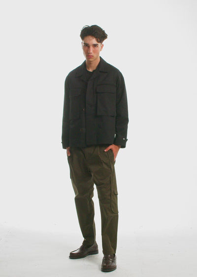 The Cavalier Jacket is crafted from premium Japanese twill. Designed as a year-round essential. Transitions between occasions and seasons. Its unique placket design ensures that when fully buttoned, only a single button remains visible, a signature Descendant of Thieves detail that sets you apart. Thoughtful craftsmanship includes convertible chest pockets, where the flaps can be tucked in to expose a contrast fabric detail, a hidden utility placket pocket inspired by hunting jackets, and a subtle lapel that allows it to be worn as a structured jacket or a relaxed shirt-jacket style. Small-batch craftsmanship, unexpected details, and a commitment to individuality define the Cavalier Jacket.