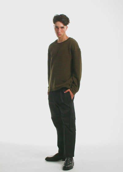 This piece is crafted from a jacquard knit fabric with a geometric grid texture. The pattern is engineered directly into the fabric using a jacquard loom, creating raised squares for added dimension. The weave creates a more distinctive way to wear a solid color, making it a great alternative to a solid plain weave item. It's a statement piece disguised as a solid. The back features our Exterior Shadow Label: a discreet rectangular patch that shadows the silhouette of our interior label. No logo, only a silent mark of belonging for those who wear Descendant of Thieves.