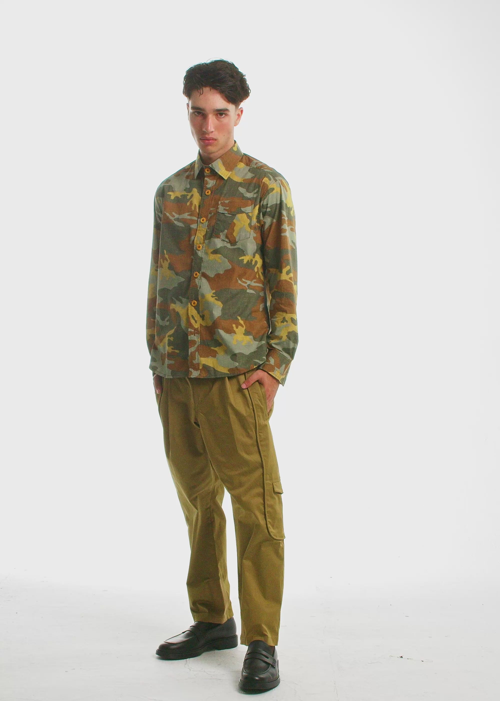 This camo was never made for hiding. Reimagined with golden tones that cut through it. A quiet break in the rules. The buttons are corozo, carved from a South American palm nut. Not plastic. Hard as bone, smooth as ivory. They stand against the camo, a subtle disruption in the uniformity.