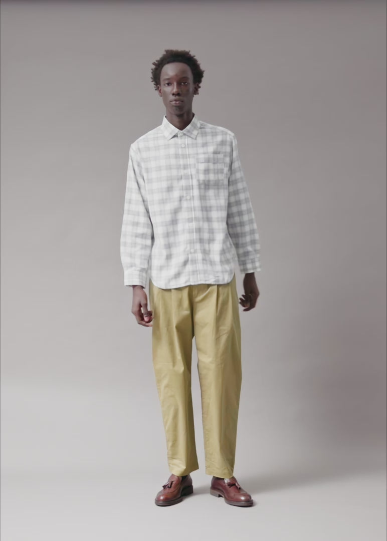 This shirt takes the ease of a heritage flannel and redefines it with tonal restraint. Woven from a brushed cotton blend for an ultra-soft hand, its pale gray check sits on an ivory base, creating texture. The Ghost X Plaid shirt is the flannel elevated to quiet sophistication.