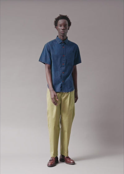 Clean at first glance, calculated up close. This shirt is built from a textured cotton weave that disrupts the idea of “plain.” The wide floating front placket stops short of the hem, crafted with such precision it appears almost impossibly suspended. Intentional. Architectural. Unpredictable. Minimalism, through a Descendant of Thieves lens.
