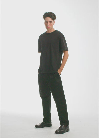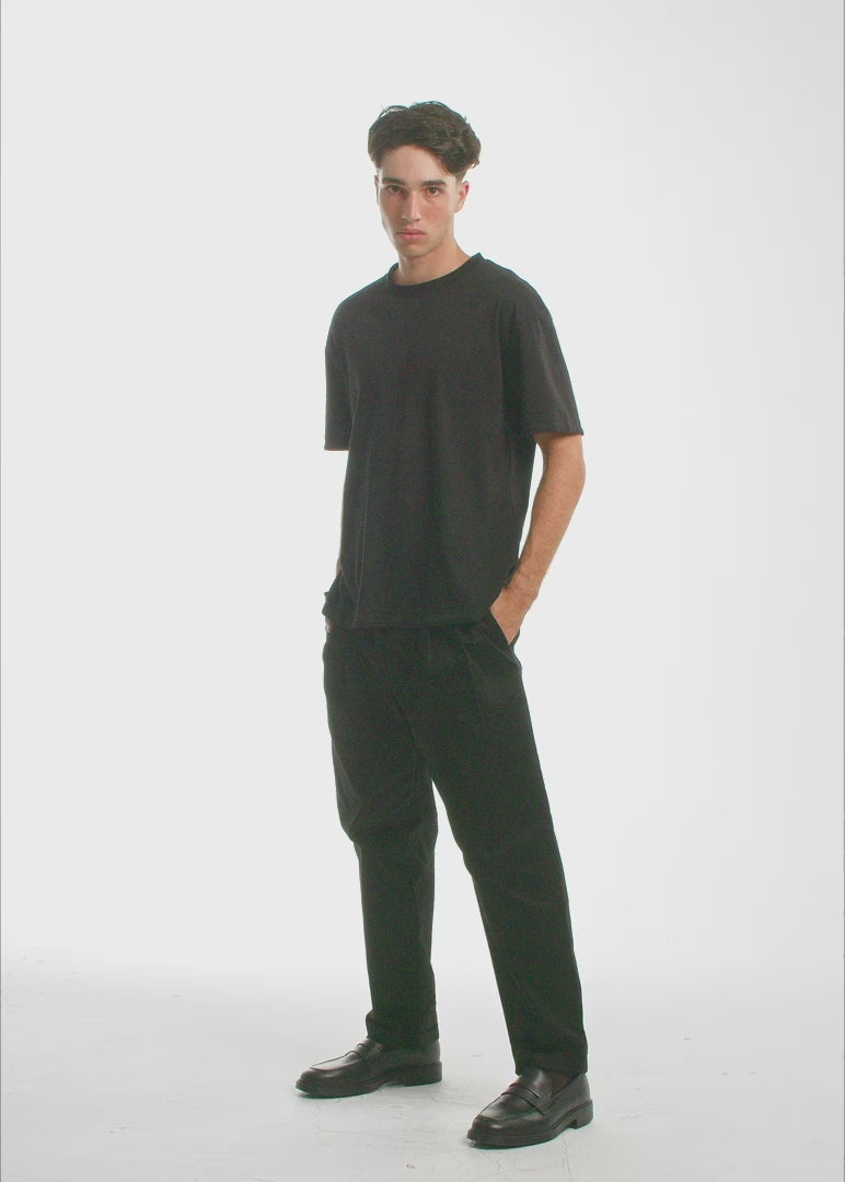 The Black Twill Boxer Fit pant is a wide single-pleat Pant designed for those seeking a relaxed fit. Crafted from soft yet durable mid-weight cotton twill with a hint of stretch for comfort and mobility. With a year-round fabric weight of 185 grams, they are versatile for all seasons, including the warmer months. As with all of our pants, we have a hidden zip pocket built into the left pocket to quietly protect your valuables and a mobile pocket inset on the right pocket to safeguard your screen from scratches and movement. A back triangle button closure flap can be tucked away and hidden. An effortless blend of style and functionality.