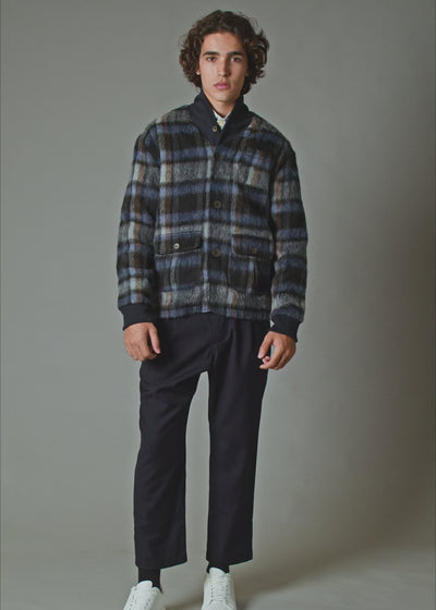 Crafted from a luxurious wool blend, this jacket features a bold plaid pattern in shades of blue, brown, and grey. Its unique texture offers style and warmth, complemented by reinforced elbow patches and a versatile shawl collar that can be worn up or down. The front pockets are detailed with vintage military-inspired pleats, adding a functional yet stylish touch. This piece is both functional and statement-making, and a choice option for elevating a cold-weather outfit.