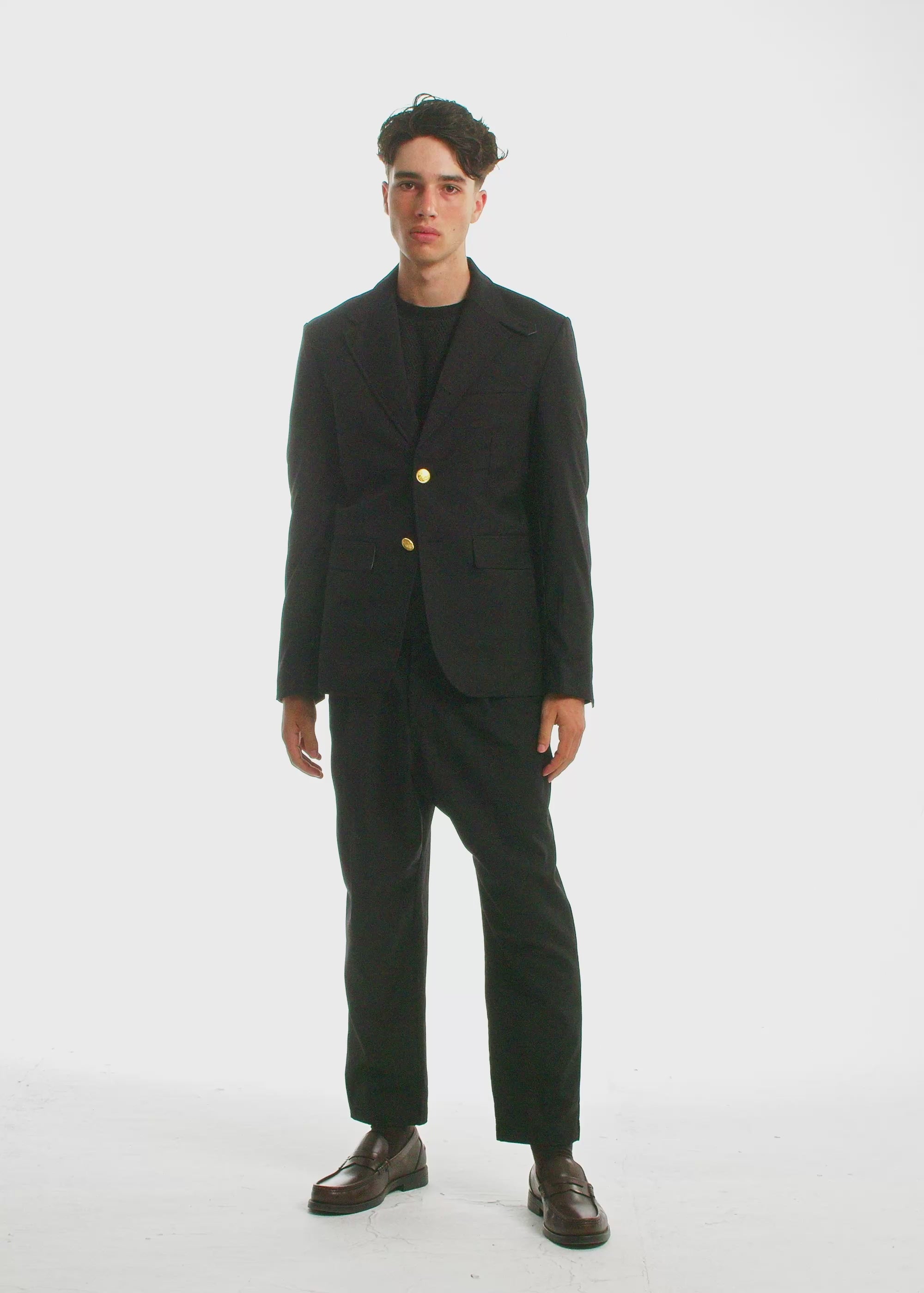 This year-round tropical wool-blend blazer is crafted with sophistication. Its design is inspired by the classic prep school blazer, featuring gold buttons. However, we added a modern touch, including interior striped straps for carrying. The intention behind this jacket is to wear it paired with matching pants or with more casual attire.